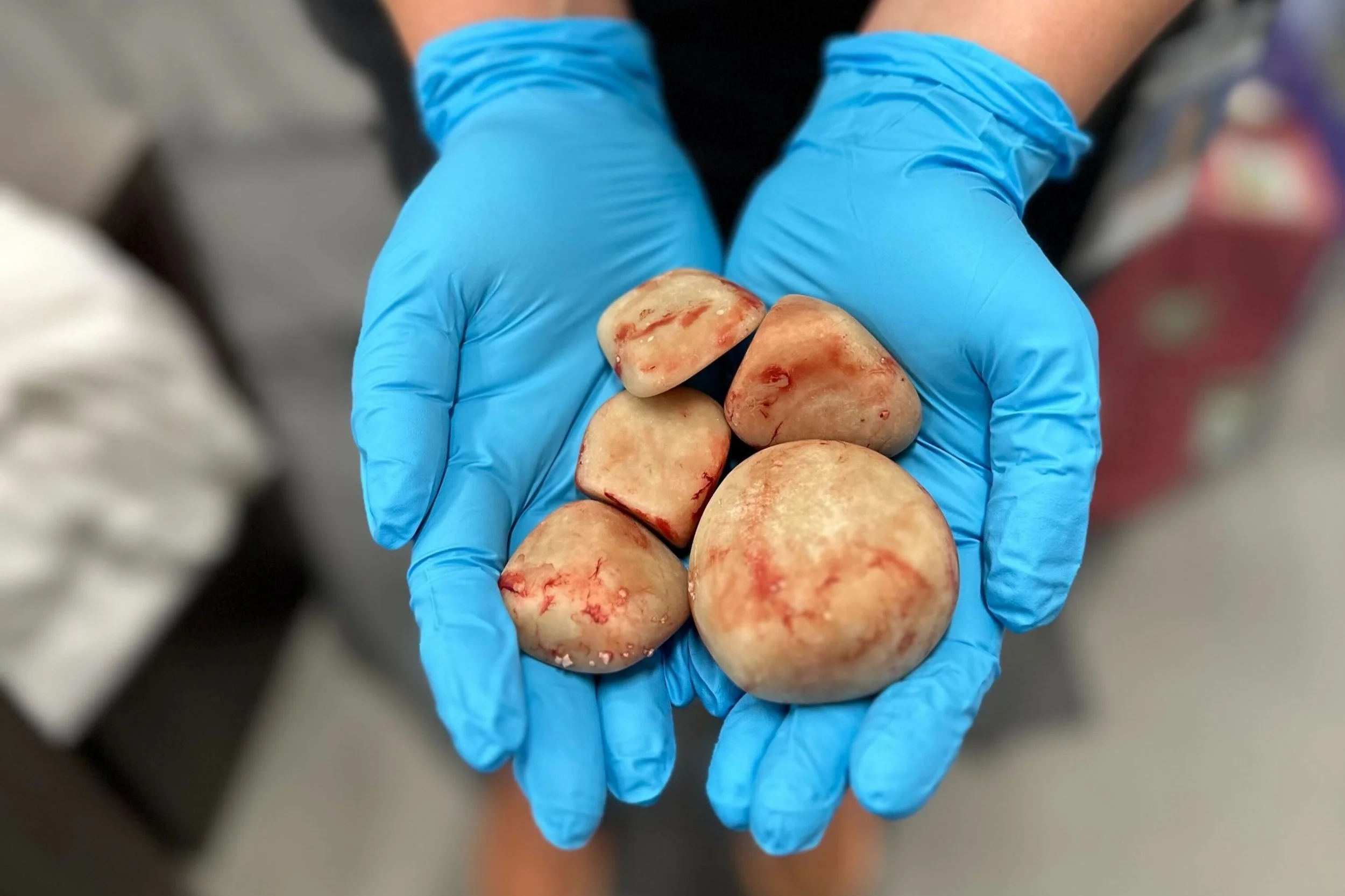 X-rays revealed several large bladder stones- painful, obstructive, and in need of surgical removal.